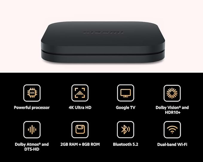 Xiaomi TV Box S (2nd Gen), 4K Ultra HD Streaming Media Player, 2GB RAM 8GB ROM Smart TV Box, Soporta Google TV, Dolby Vision, HDR10+, Dolby Atmos, DTS-HD, Wireless Projection, Dualband-WLAN, Negro