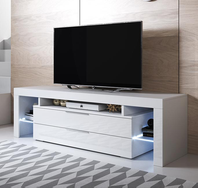 Mueble TV suspendido con 2 nichos – LED – 140x40x30,5 cm – Madera MDF – Blanco brillo