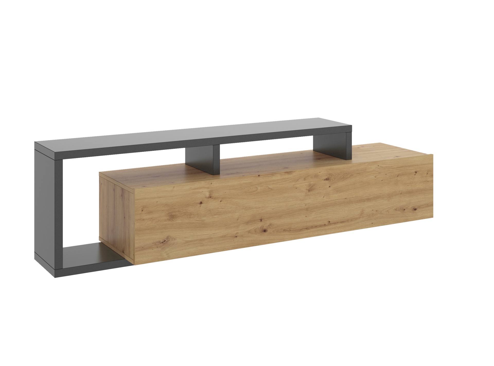 Salón modular en color roble artisán, frentes en negro y roble efecto alistonado.