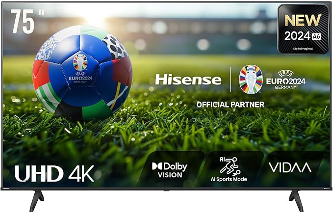 2) Hisense – Televisión de 75 pulgadas, 4K Ultra HD, 75A6N, Smart TV, VIDAA U7, Dolby Vision, HDR 10+, DTS Virtual:X, modo de juego, Alexa integrado, voz VIDAA, sintonizador DVB-T2/S2 HEVC 10, Lativu 4K [Clase de eficiencia energética E]